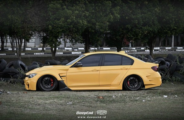 This is a case study of a yellow BMW F30 wide body airride